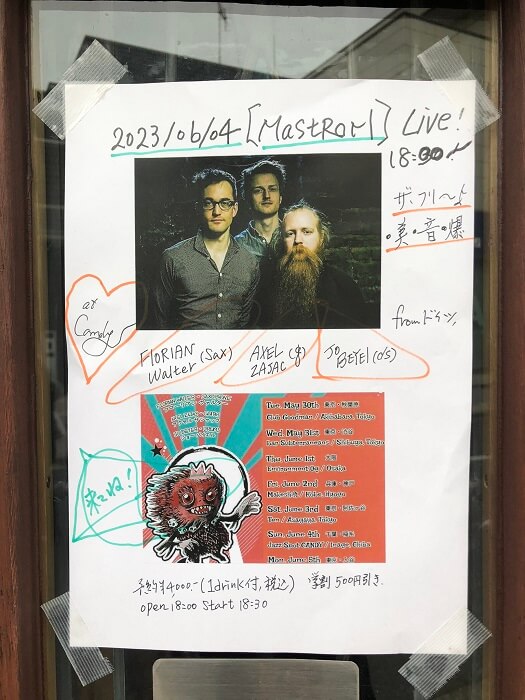 住宅地のど真ん中にある扉を開けるとジャズ・レジェンドたちの肖像写真に囲まれた音楽空間が広がるマジカルなスペースで繰り広げられるドイツ・アヴァン・ジャズの熱演は、おそらくヨーロッパの田舎町のライヴハウスやジャズカフェでの演奏に近いシンパシーを感じたに違いない。