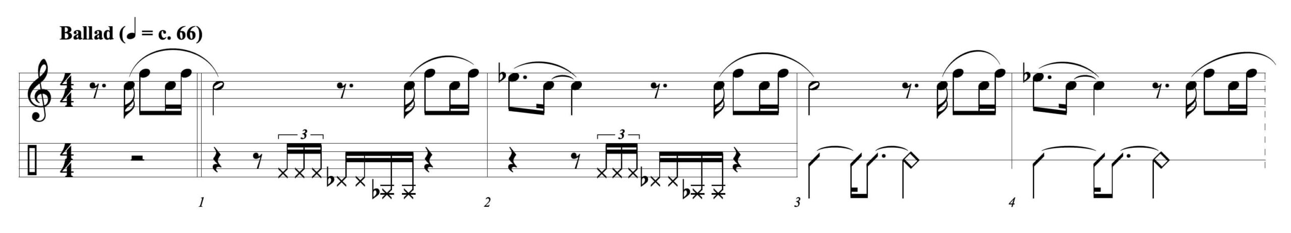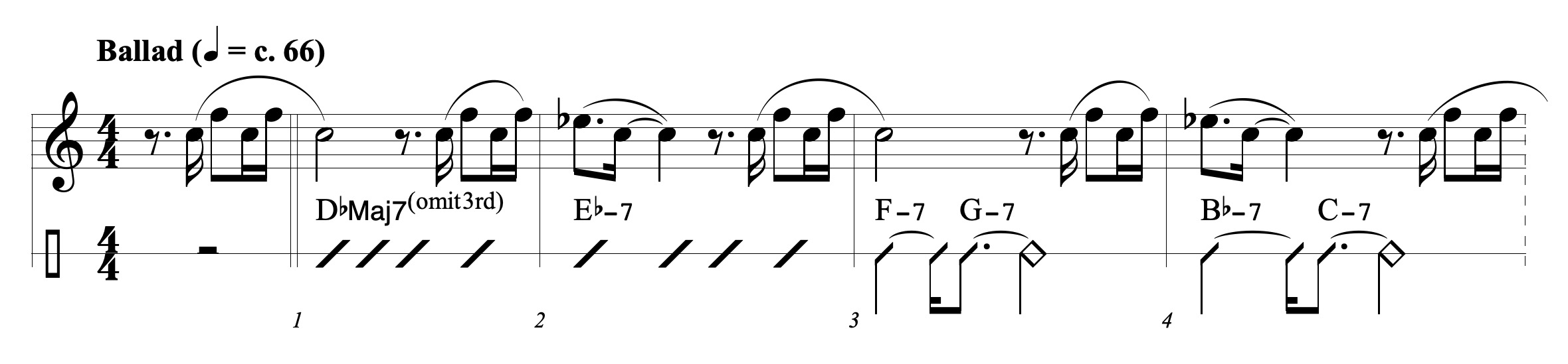 このCとFの跳躍が第一テーマで、単純でよくありそうなフレーズなのにやけにキャッチーだ。コード進行でお分かりのように調性はD♭メジャーだが、最初のコードで3度を抜いているので重いサウンドを醸し出している。この出だしを聴いてまず耳を引くのがドラムのタムタムがD♭メジャーにチューニングされており、ハイ・タム、ミッド・タム、フロア・タムと下降するフレーズが実にオシャレなのだ。採譜してみた。