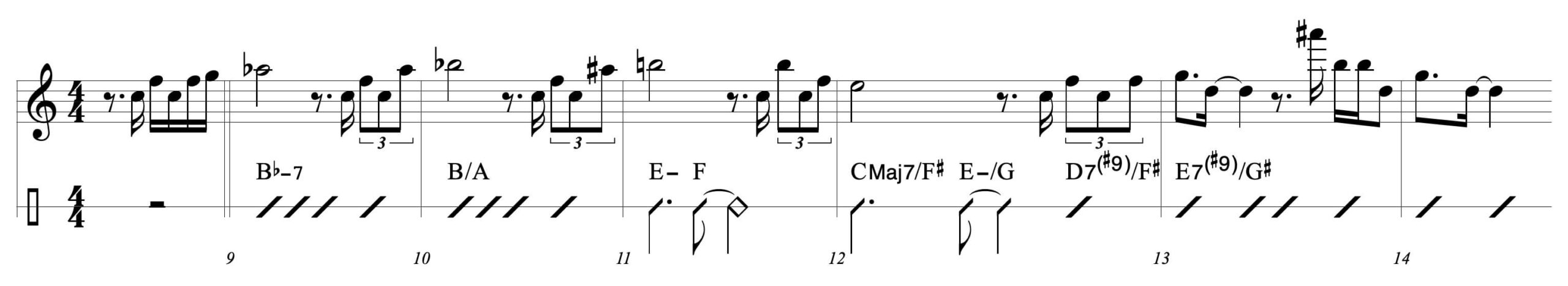 第一テーマが2回繰り返されたところで9小節目から第一テーマの展開が始まり、半音下のCメジャーに一時転調する。George Russell(ジョージ・ラッセル)のリディアン・クロマチック・コンセプトで言う外向5ステップ移動なので(詳しくはこちら)半音下がってもサウンドは浮上している。そして、第一テーマの動機に戻る前に、E7(#9) をピボットにしているところが実に美しい。 採譜をご覧いただきたい。
