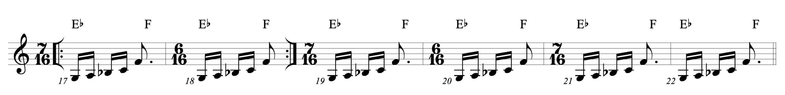 始まって2分の位置から第二テーマが始まる。いよいよ変拍子の登場だ。変拍子ではあるが、ここでもミニマリズムのオスティナートだ。ちなみにここからの調性はGマイナーだ。このオスティナートを8小節繰り返して第二テーマの展開形になるのだが、その1小節前(下図小節22)を16分の6拍子ではなくで16分の7拍子にしてフレージングの切れ目を作っているところが興味深い。