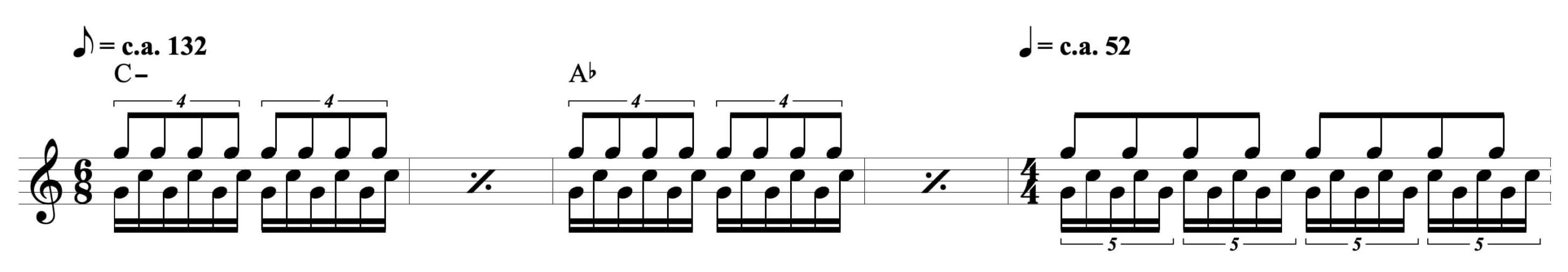 まずこの曲で最も重要なのは、16分音符が一定したパルスとして最後まで持続するということだ。ミニマリズムの手法だ。このパルスを維持し、ヘミオラのレイヤーを用いてセクションごとにテンポを変化して行く、その技法が素晴らしいのだ。つまり、この曲の16分音符は約264BPM(1分間に264回の意)であり、4分音符ビートは66BPM、8分音符ビートはその2倍の132BPMになる訳だが、付点4分音符ビートは8分音符ビートの3分の1の44BPM、そして16分音符が5連譜で1拍となった時4分音符ビートが約52BPM(正確には264BPMの5分の1である52.8BPM)になるという展開が素晴らしい。