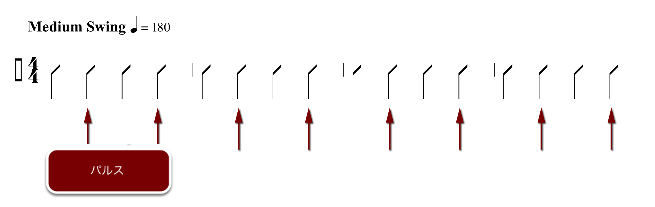 まずは一般的なミディアムテンポのウォーキング・ベースがグルーヴするジャズ。ビートは4分の4、パルスは2と4に発生する。