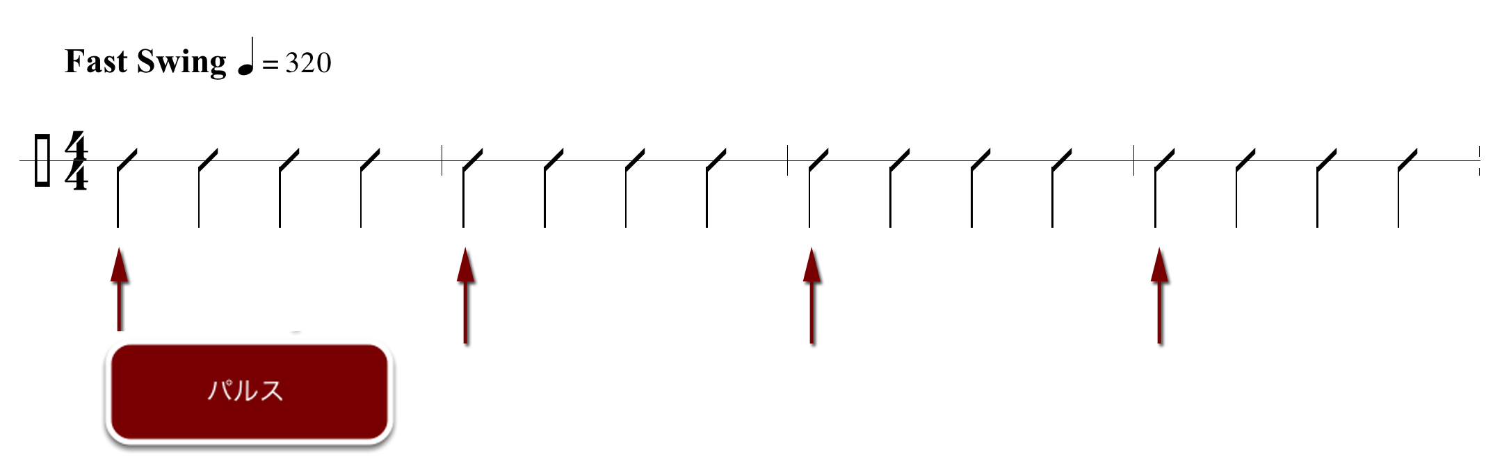 さて、ここで話題にするビートとパルスの関係を図解してみよう。アメリカ黒人音楽から派生した音楽は全てビート2とビート4にアクセントが置かれる。これはアメリカ黒人の歩き方や喋り方が反映されたものである。