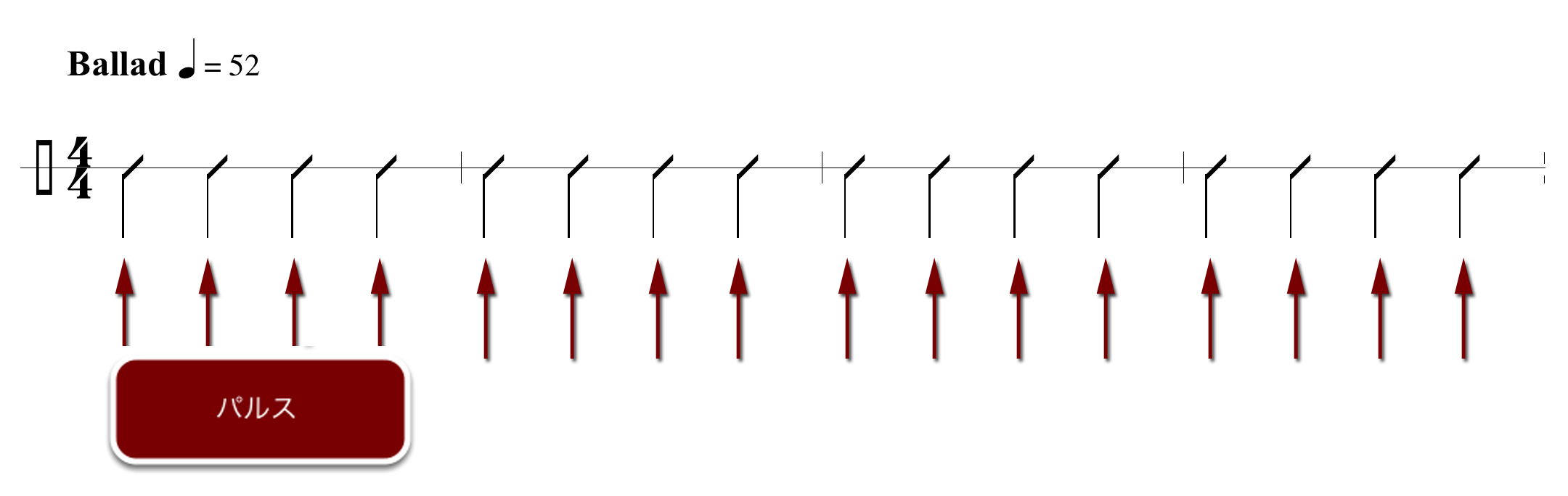 反対にバラードのように遅くなると、今度はビートひとつずつにパルスを感じる余裕が出る。このスタイルの音楽は2と4でグルーヴするのに、バラードではそういうグルーヴ感がないのはこれが理由である。このテンポで敢えて2と4にアクセントを入れるとロック・バラードになるが、それでもパルスはすべてのビートなので混乱せぬよう。
