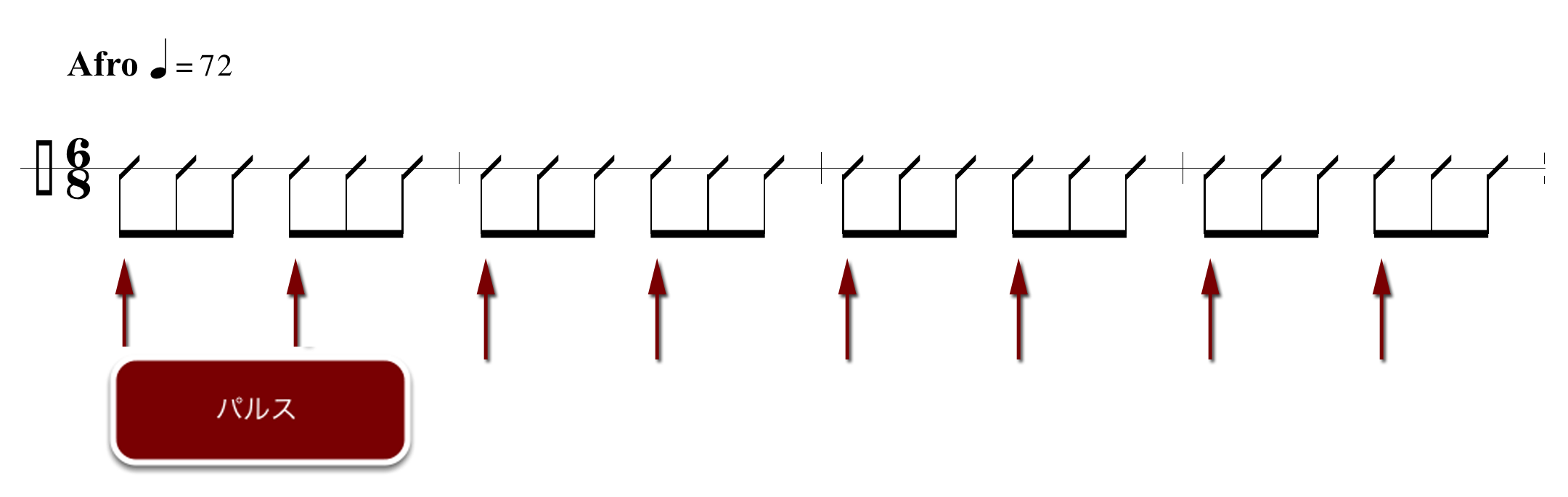 3拍子同様に6拍子の曲のパルスは1小節に2パルスである。