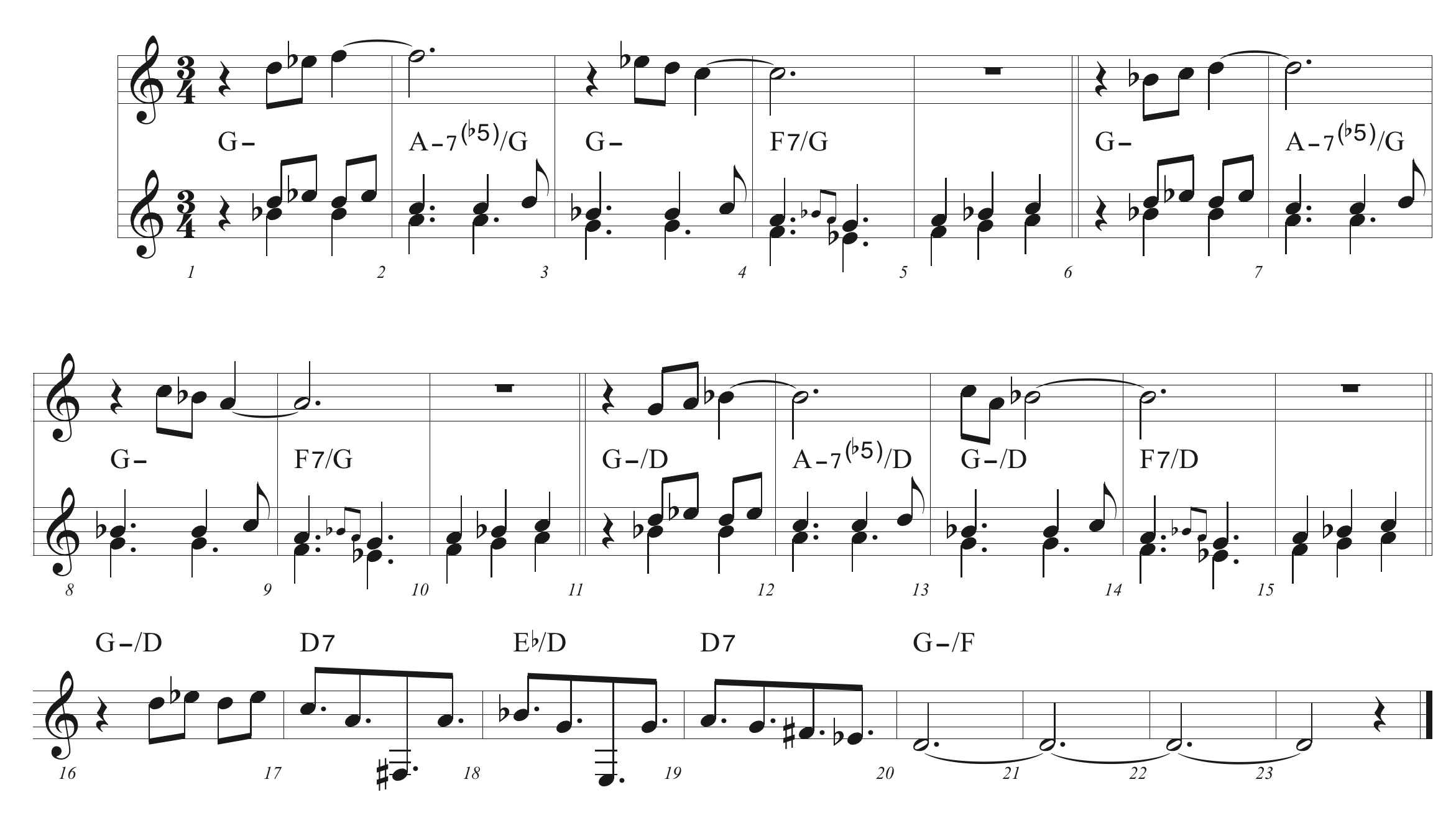 - G♭Maj7がF-7にアプローチするのならわかるが、目的地はB♭マイナーであり、5小節目でダウンビートをミスったのは計画間違いをしたように聞こえる