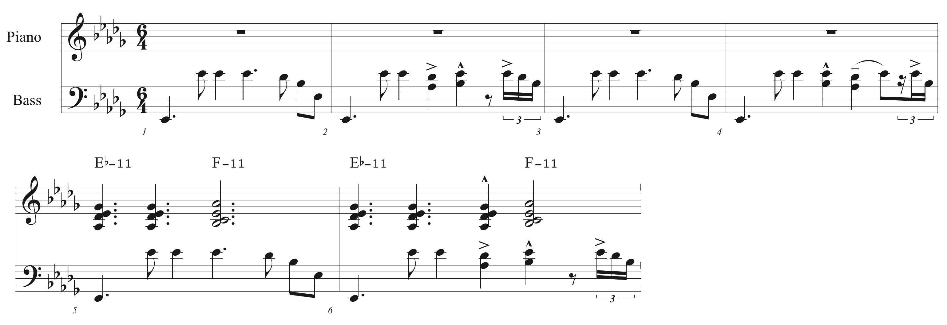ご覧の通りこれは6拍子の曲だ、が、6/8拍子ではなく6/4拍子だ。その理由は、8分音符がスイングの8分音符、つまり3連を感じた8分音符なので、4分音符をビートとした概念にしないとスイング感が出ないからだ。コルトレーンのこのスタイルをよく「八・六のアフロ」というような言い方で聞くが、それは間違いだ。8分音符をビートの基準とすれば8分音符はスイングでなくストレートビートで演奏しなくてはならなくなり、コルトレーンのスタイルのそれとは一致しない。余談だが、ギグに行って譜面を出されて、即座に概念を受けることができない譜面、例えばこの曲が6/8拍子で書かれてあった場合、初見でスイング感を出して演奏することはまず無理だ。作曲者は常に演奏者が初見でも作曲者の意思が即座に伝わる書き方をしなければならない。残念ながら現場重視のジャズでこういう教育はまだ浸透していない。