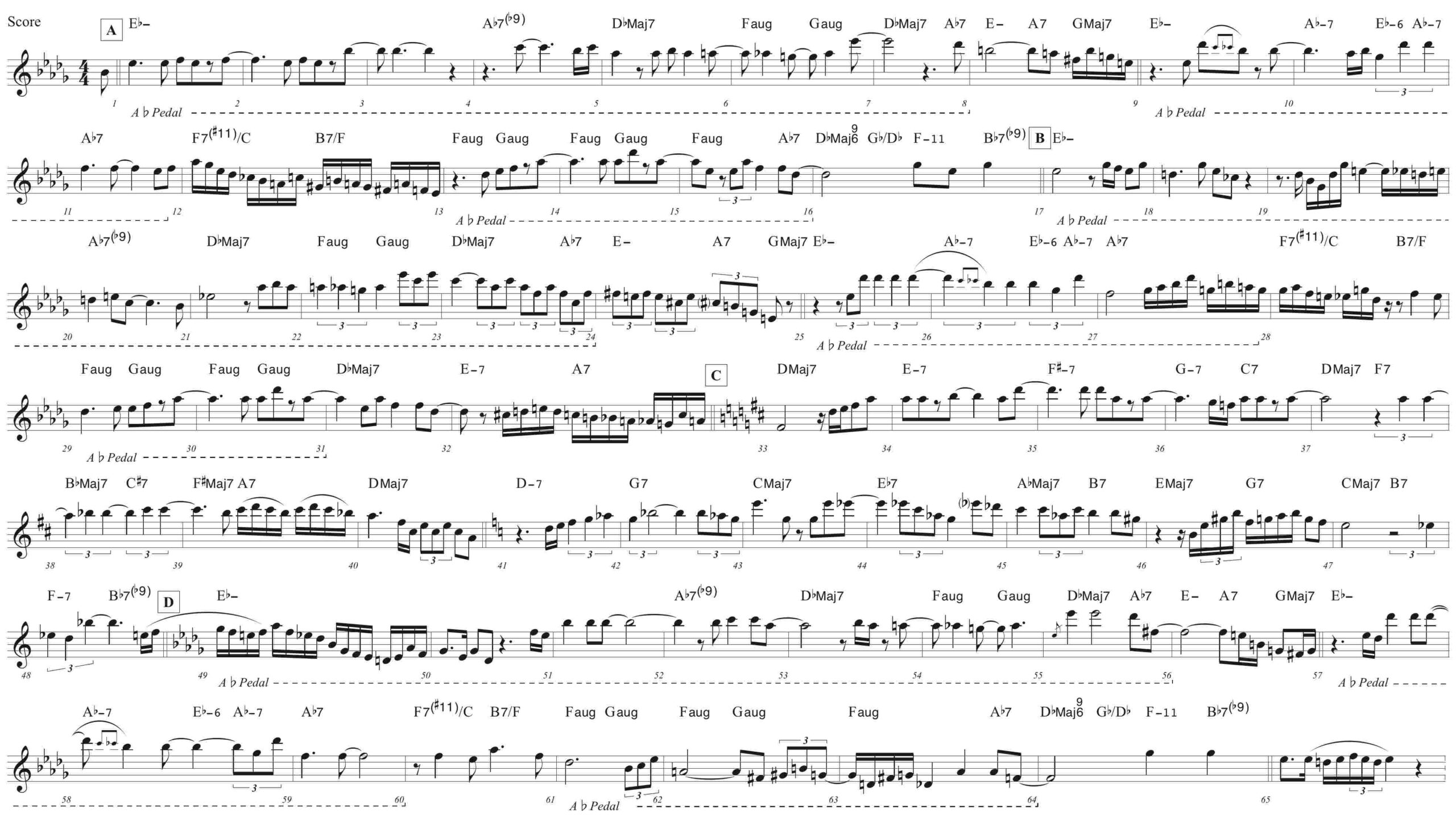 譜面で分かるようにブリッジを除くセクションの最後で、主調であるD♭メジャーに落ち着く時にA♭ペダル音が途切れるわけだが、そこに行き着くまでそのペダル奏法を期待以上に長く持続させている半面、このセクションで二度、譜面上で8小節フレーズの最後(実際は4小節フレーズの最後)で一瞬急に調性外の II-V のルートを披露してハッとさせるのだ。初めて聴いた時唸ってしまった。