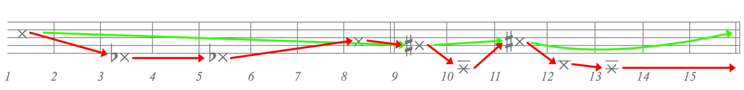 作曲法にとって山形の地図は重要な要素だ。これが曲の説得力を決める。この地図を示すために上図の譜面で赤の矢印と緑の文字で音の高さを上から順番に番号付けした。番号を追って頂いても分かりにくいかも知れないので、見やすいように次に地図だけ抜き出してみよう。高さの比較のために9小節目のA♭音はG#音に、10小節目のB♭音はA#音に書き換えた。赤矢印は鈍行、緑矢印は急行とお考え頂ければ良い。最も注目すべきは全体の一番高い位置から始まっていることだ。これは作曲法として実に珍しい。全く起承転結を踏襲していないのだ。この意図はなんだ。それは16小節のヘッドの頭のインパクトの強調だ。だから何度繰り返しても毎回がステートメントになり得るというわけだ。これを一瞬にして見通したのがマイルスなのだ。