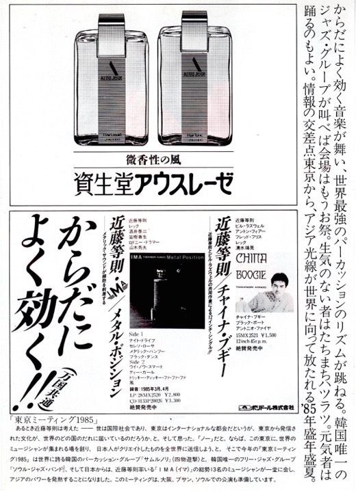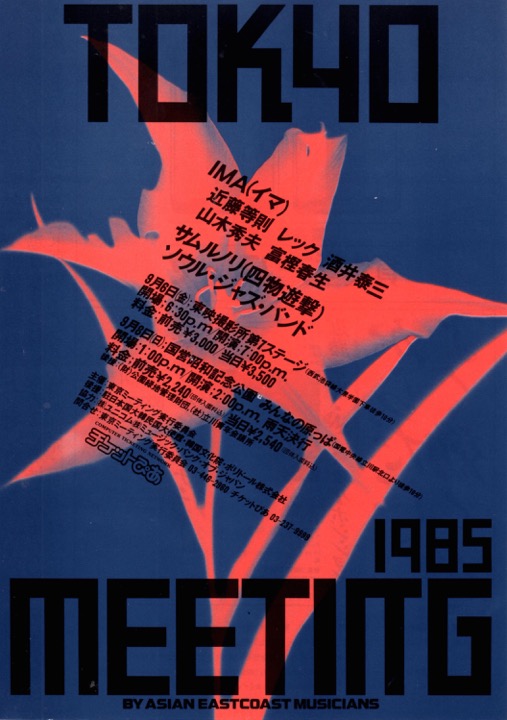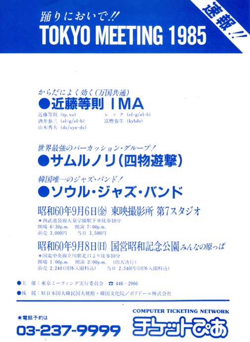 近藤とはそういう素地があって「Tokyo Meeting 1985」を共催することになった。近藤は新結成の近藤等則&IMAで参戦、韓国からはサムルノリ、ソウル・ジャズ・トリオが参加、キャスティングは近藤がイニシアチブをとった。IMAは前身のTBALBを一新、新進気鋭の富樫春生(key)、酒井泰三(el-g,el-b)、Reck(el-g,el-b)、山木秀夫(ds)で結成された。サムルノリは1978年に金徳洙(キム・ドクス)によりソウルで結成され、1980年に正式に「サムルノリ」(四物遊撃)と名乗り、来日メンバーはその後レギュラー・メンバーとなる金徳洙、李光壽(イ・グァンス)、崔鐘實(チェ・ジョンシル)、カン・ミンソク。担当楽器は、それぞれチャンゴ(杖鼓)、ケンガリ(小鉦)、チン(鉦)、プク(太鼓)。