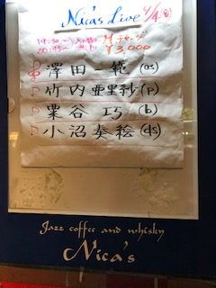 ジャズの入門書風に言えば、1940年代は、ビ・バップの時代、続く1950-60年代は、ハード・バップの時代と言うことになるのだろうが、こちら我らがニカズという名のタイムマシーンでは、その約10-20年間の時の流れをわずか一週間で味わうことが出来るのだからなんともイカシテいる。先週金曜日に、バードライクのアルト澤田一範4 の快演に触れたのも束の間、今宵は、熱いスイングの一本道に出会うことに。