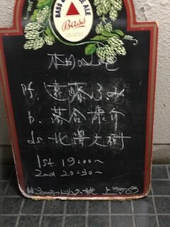 そうして今夜もDUO。今宵の同行者は、広瀬淳二氏(B)だ。これまで私にとっての広瀬氏は、いつの日もテナーサックス奏者であったが、このコンビの時は、ベースを選択されることが多いとのことだった。お聞きすると、今夜も店のドアの看板の当初の(B/SAX)のSAXの文字を自ら消されたとのことだった。