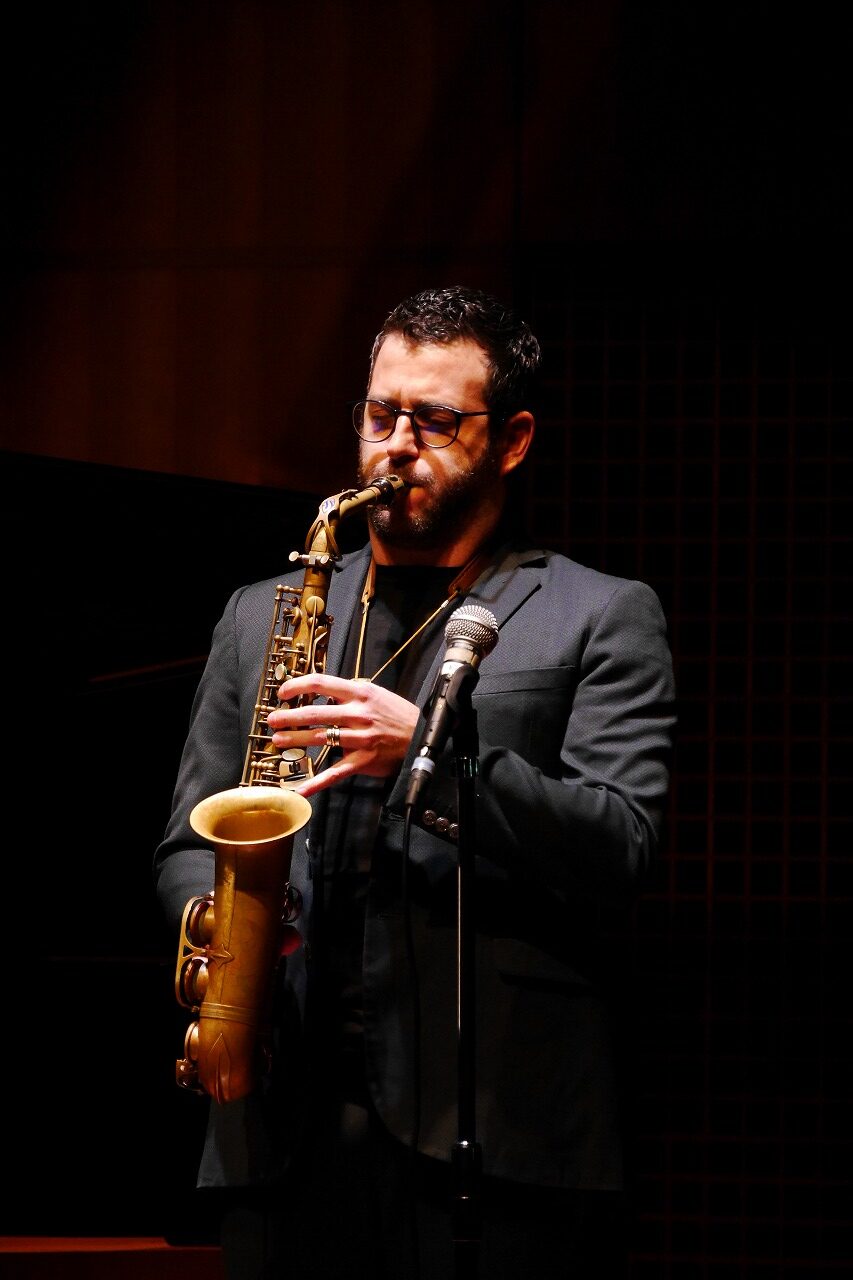 〈16ミニッツ~〉はカフィーソのオリジナルで、ブロックのイントロ~テーマをピアノ・ソロで進める。カルテットやラージ・コンボなど色んなフォーマットで演奏しているのでカフィーソのファンならおなじみかもしれない。細かなフレーズが連続してテーマを奏でる。ピアノのテーマがサックスとのユニゾンになり、細かくソロ交換したり。何度も演奏しているのだろうか。とてもリラックスした雰囲気だったのが、どんどん緊張感が漲ってきて、ブロックのアドリブパートに。ここでも煌めくようなフレーズをまき散らしながらスイング溢れる、明るいソロである。カフィーソのソロ・パートでは、ところどころにフリーっぽいプレイやコミカルなプレイも散りばめながら熱は帯びていく。そのたびに客席から大きな拍手が湧いた。