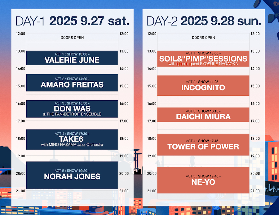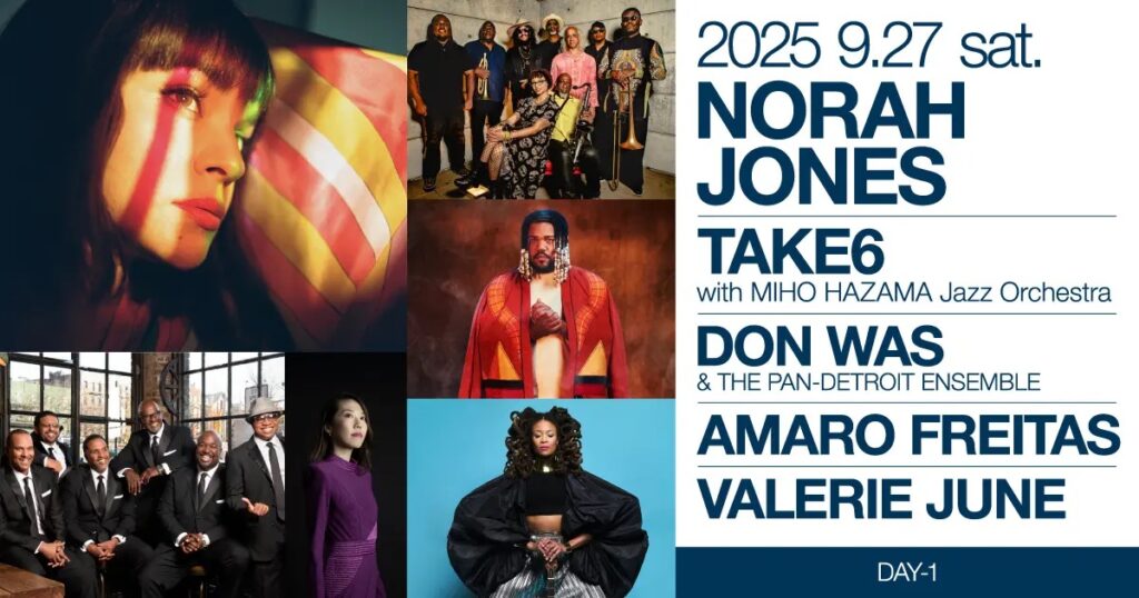 初⽇は、ブルーノート・レコードからのデビュー作『ノラ・ジョーンズ』がグラミー賞5冠を記録。アルバムのトータル・セールスは5300万枚を越えるシンガーソングライター ノラ・ジョーンズ。10度のグラミー賞に輝く“地球上最⾼のヴォーカル・グループ” テイク6 と世界を舞台に活躍するジャズ作曲家・指揮者 挾間美帆 の史上初共演となる テイク6 with 挾間美帆ジャズオーケストラ。ミュージシャン、プロデューサー、ブルーノート・レコード社⻑など、多⽅⾯にわたる活動を続ける異才ドン・ウォズ 率いる ドン・ウォズ & パン・デトロイト・アンサンブル。ブラジル出⾝のルーツを⼤切にしながらあらゆるボーダーを超えて世界を熱狂させている、いま最も注⽬すべきピアニスト アマーロ・フレイタス。ボブ・ディランから称賛を受け、ノラ・ジョーンズ、エルヴィス・コステロなど数多くのアーティストとも共演し、アメリカーナ・ムーヴメントを代表するミュージシャン ヴァレリー・ジューンが出演。