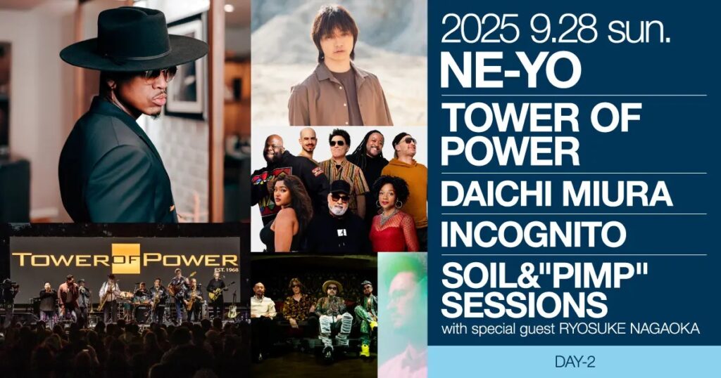 2⽇⽬は、3度のグラミー賞受賞、全世界で合計230億回ものストリーミング再⽣を記録。R&B界のトップ・シンガーソングライター/プロデューサー ニーヨ。迫⼒のアンサンブルと強烈なビート、灼熱のサウンドで熱狂を⽣む、⽶⻄海岸が⽣んだ“宇宙最強のファンク・バンド” タワー・オブ・パワー。各所のアリーナ単独公演を次々と成功。天性の歌声とリズム感、抜群の歌唱⼒と世界⽔準のダンスで⼈々を魅了するスーパーエンターテイナー 三浦⼤知。ギタリスト/プロデューサーのジャン=ポール“ブルーイ”モニックが率いる、アシッド・ジャズ・シーンを牽引するUKジャズ・ファンクの最⾼峰 インコグニート。31カ国で公演を⾏い世界と⽇本を繋ぐ SOIL&”PIMP”SESSIONS が、ギタリスト、プロデューサーなど多彩な活動を展開する神出⻤没の⾳楽家 ⻑岡亮介 をゲストに迎えて送る SOIL&”PIMP”SESSIONS with special guest ⻑岡亮介 が出演。今年も世代/ジャンルを超えた出演陣が、東京・有明アリーナに集まる。