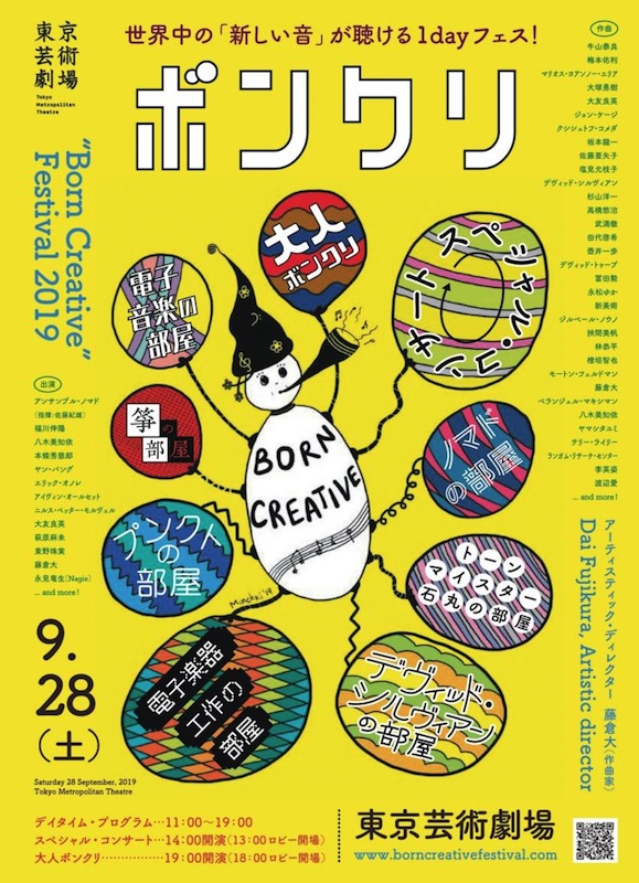 2017年にスタートした”Born Creative” Festival(略称:ボンクリ・フェス)。ボンクリ=「人間はみんな、生まれつきクリエイティヴ!」というコンセプトのもとに世界中の「新しい音」が聴ける1dayフェスが今年も開催される。熱い視線を受ける気鋭の作曲家 藤倉大をアーティスティック・ディレクターに迎え、音楽に国境はないという言葉をそのままに、PCを駆使して世界中とボーダレスで繋がり、朝から晩まで一日中、東京芸術劇場は「世界中の新しい音」に満ち溢れる。詳細はボンクリ公式ウェブサイト。全体像をコンパクトに見るには東京芸術劇場ウェブサイト。挾間美帆による「NEO-SYMPHONIC JAZZ at 芸劇」に続く東京芸術劇場の攻めの企画シリーズで、挾間美帆、大友良英の作品も演奏される。