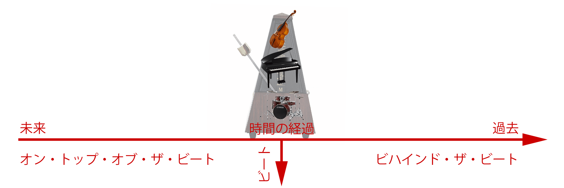 いや、もしかしたら「ベースもドラムもオン・トップ・オブ・ザ・ビート」という概念に読者は困惑して来たかもしれない。ではいつものようにビートとタイム感を図にしてみる。
