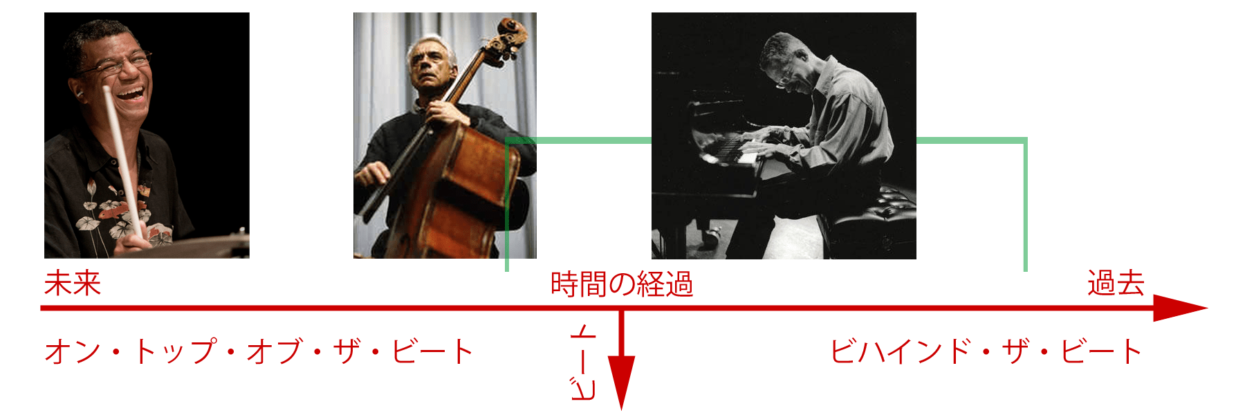 まず我々がもっともよく耳にする、ガンガンにグルーヴするコンボ、ピアノトリオで言えば、ベースがオン・トップ・オブ・ザ・ビート、ドラムがビハインド・ザ・ビート、ピアノがその間にできた空間で自由にスイングしまくるの図。