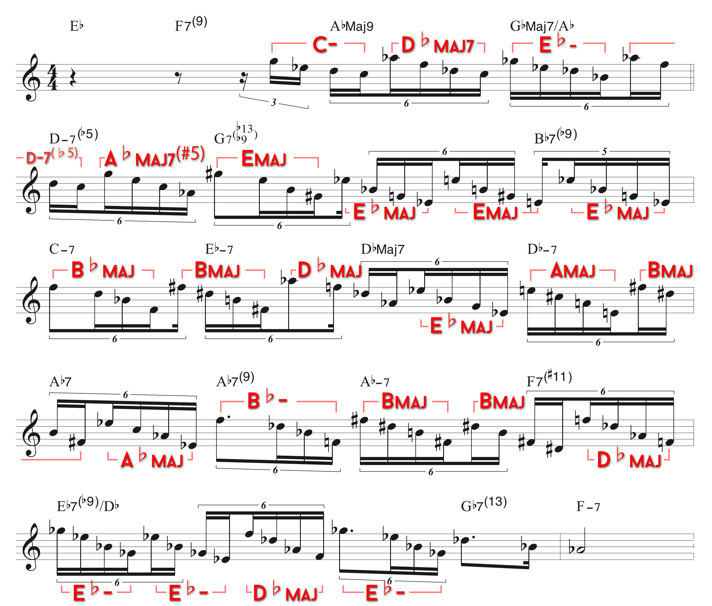 そして、キースの左手のコードに対してアウトする右手が前述の垂直アプローチで、はっきりと何のコードを想定しているか聞き取れ、二階建て構造になっているのがわかる。しかし全くの二階建て構造でアウトしているように聴こえるのだが、こうやって書き出して見ると、ハーモニー的にはそれほどアウトしているわけではない。全て理論的に説明できる範囲だ。注目して頂きたいのは、左手はコードネームで示すように拍子にはまっているのに、右手はそのビートの拍子からかなりずれているから見事な2階建構造が出来上がっているように聞こえるということだ。