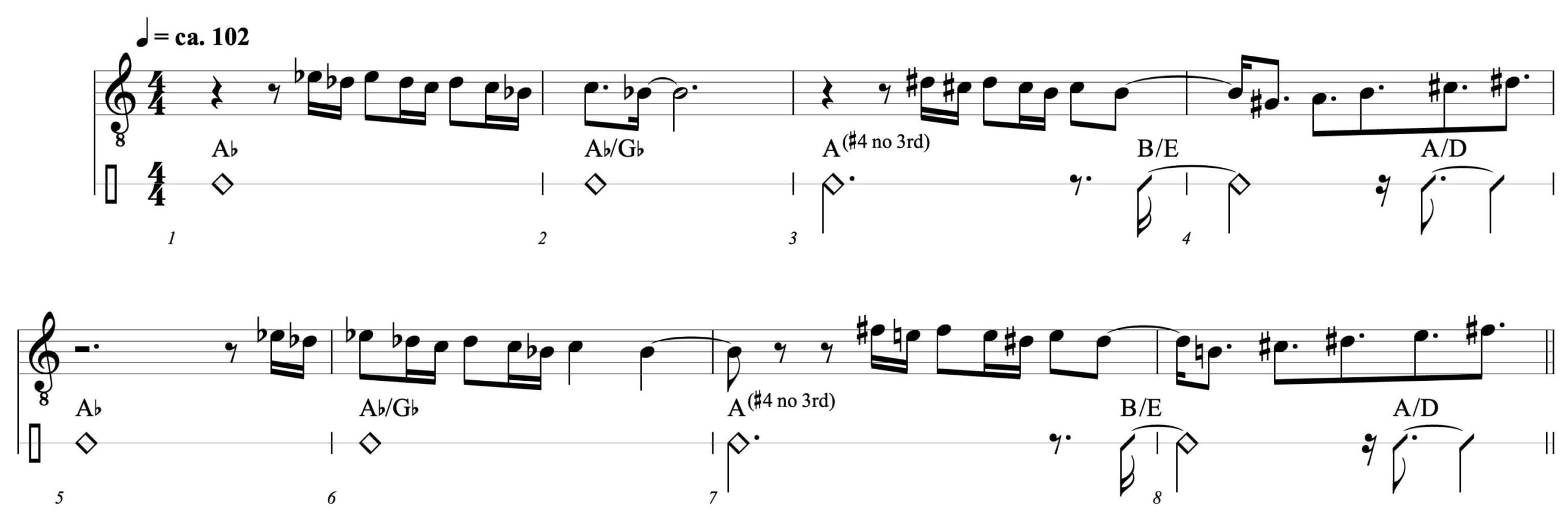 次に、メロディーの形をご覧頂きたい。この4小節フレーズを単純に2度繰り返すのではなく、2度目はなんと2拍ズレている。そのズレに杭を打つように6小節目の3拍目と4拍目でダウンビートにしているのがおしゃれだ。ちなみにこのメロディーのアンティシペーションといい、ライアンとカミラのビハインド・ザ・ビートのタイム感といい、これはブラジリアン・ジャズのそれだ。それに対極するようにエリックのバックビートがオン・トップ・オブ・ザ・ビートでまくし立てるところでまず興奮した。筆者の最初のバンド、A-NO-NE Band(1987)のベースはアルゼンチン人、ドラムはスリナム人で、ブラジルにない南米のタイム感でブラジルのリズムを演奏するという趣旨だったので、ライアンに深く共感する。ご興味のある方は(YouTube →)。自分の昔の演奏は殆ど聴かないが、あのリズム・セクションは本当に興奮ものだったことをライアンに思い出させてもらった。