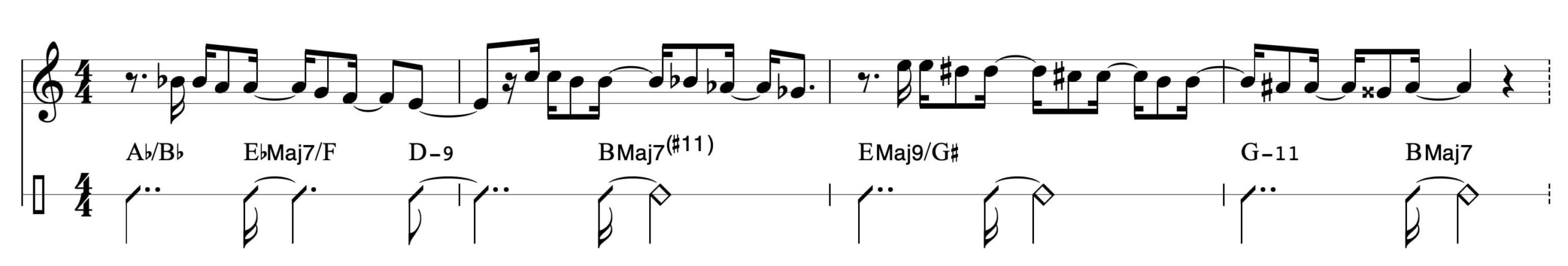 ここで驚くのが、コードスケールの先取りだ。頭の2拍目までA♭コードだというのに、メロディーは次のコードの#11音であるAナチュラルで、もちろんA♭コードとぶつかっているのだが、全く奇を衒ったサウンドがしない。お気付きの読者もいらっしゃるかも知れない。この曲はA♭Lydianのモーダルな曲だが、後半にBメジャーというとんでもなく遠い調性に瞬間転調する。そのメロディーの曲がり方が実に素晴らしい。