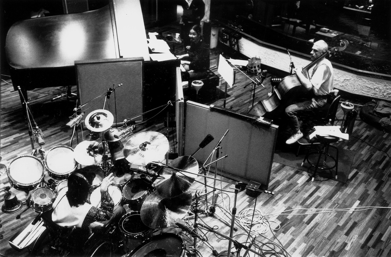 図(CD-ROM参照)でも分かる通り、3者は目線でコミュニケーションできるように配置している。目線のコミュニケーションはジャズ録音ではもっとも重要で、これが欠けると、演奏できねぇー!となる。そして、スタジオ録音では良く用いられる遮音板を使わないのも、この録音のために配慮したことである。3者が同じ空間に肩を寄せ合って遊んでいる、そういう雰囲気を創りたかった。これらの裏返しは、録音をする側から見れば、音のカブリをまともに受けるわけで,これから起こる事態を想像すると、ギョッとする。