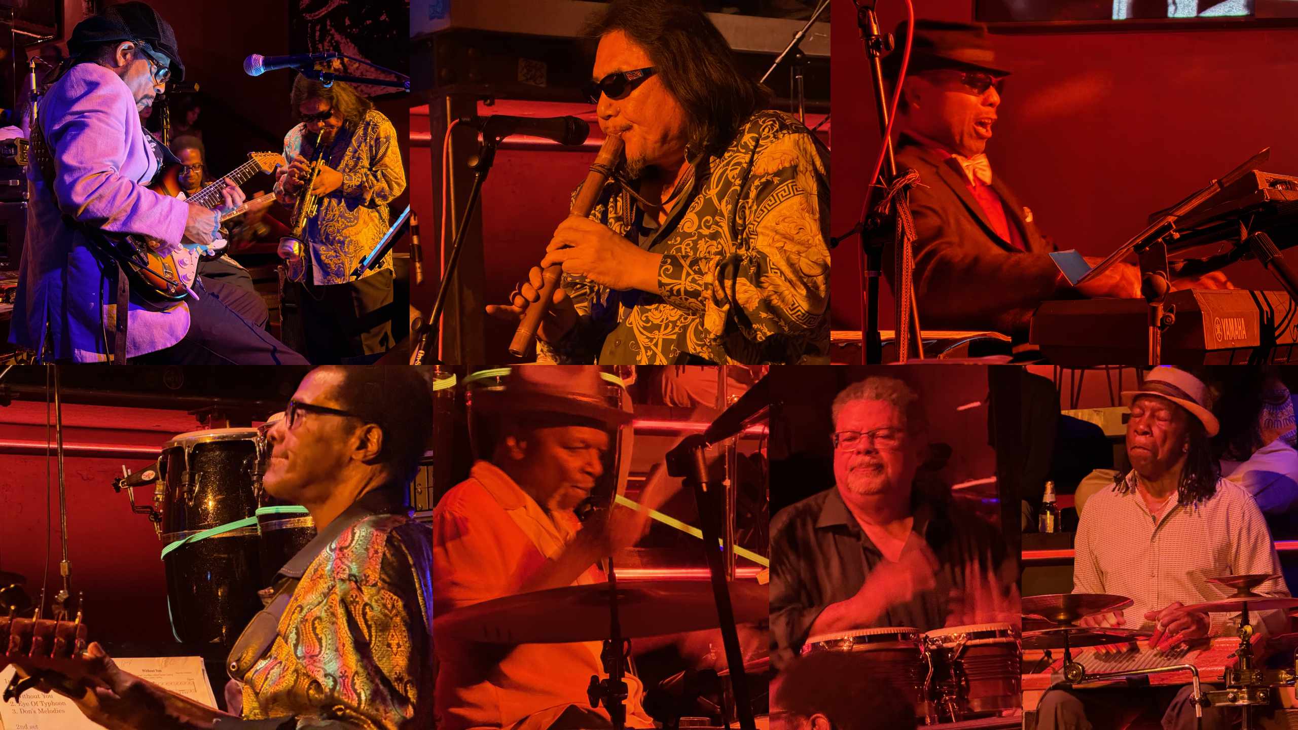 ドラマーは、昨年11月に99歳で惜しまれて他界したRoy Haynesの息子、Craig Holiday Haynes(クレイグ・ホリデー・ヘインズ)。息子と言っても70歳だ。ロイのスタイルとは全く違い、ものすごいグルーヴに徹する反面、かなり冒険もする。これだけ冒険するのに絶対ビートを外さない、すごいの一言だ。ベースのStanley Banks(スタンリー・バンクス)はGeorge Benson(ジョージ・ベンソン)のベーシストとしてご存じの方も多いと思う。彼のグルーヴはクレイグの冒険ドラミングをしっかり地に着け、見事なリズム隊コンビだった。しかもスタンリーは左足でタンバリンを演奏している。特殊なスタンドがあるわけでもない。靴を履いたまま、踵を振って強烈なグルーヴを出す。その動画を撮れなかったことが悔やまれる。