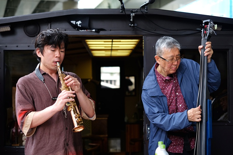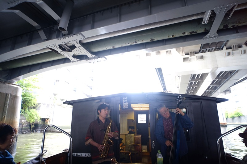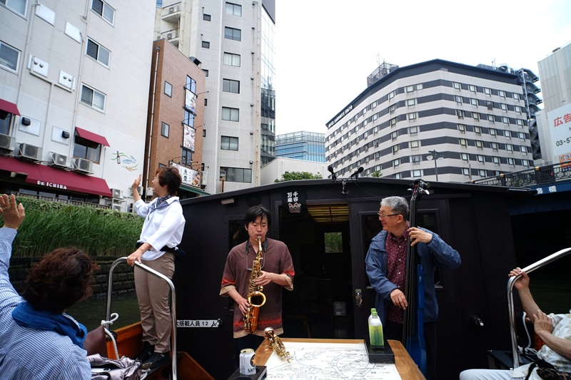 日本橋発着で東京の川を航行する「舟遊び」。かつて酒問屋が多かった霊岸島(新川)をぐるりと周り、墨田川に出て、永代橋をくぐって、また日本橋川に戻る。青木はこれまでにも三味線などを舟の上で演奏することがあった。なにしろ四谷荒木町の置屋「豊秋本」の生まれであり、幼少期から料亭の「お座敷三味線」を体得しているのだ。だが今回のテーマは「フリージャズ」である。1年前に初の手合わせを済ませ、青木も再演を希望した山田光(アルトサックス)がデュオの相手となった。舟でコントラバスを弾くのは至難の業であるから、青木が持ち込んだのはエレキベース。
