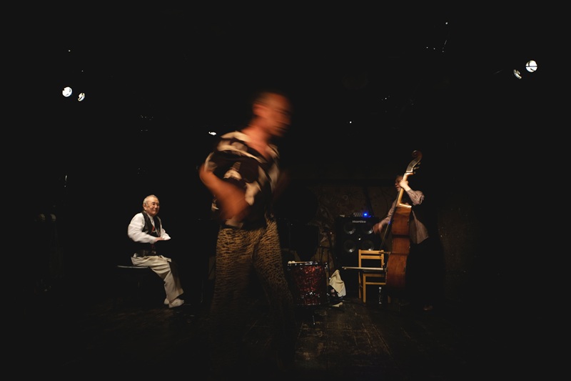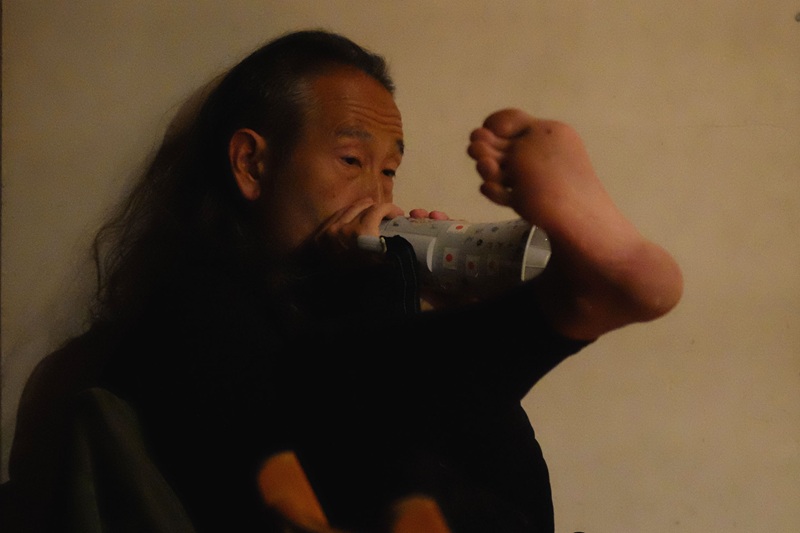 今回はそれに加え、互いに色を滲みださせあう気配があった。青木のプレイを観察する者は、かれの「音の楽しみ方」に強い印象を覚えるかもしれない。どぎつい芝居のように出番がまわってくる山下のピアノと戸松美の床板を鳴らす音、青木はそれらを微笑み目を瞑って受け止める。その間にもコントラバスのネックを両手で握ってもたれかかるようでいて、実は指先で弦を弾いて次の展開をねらっているようにみえる。