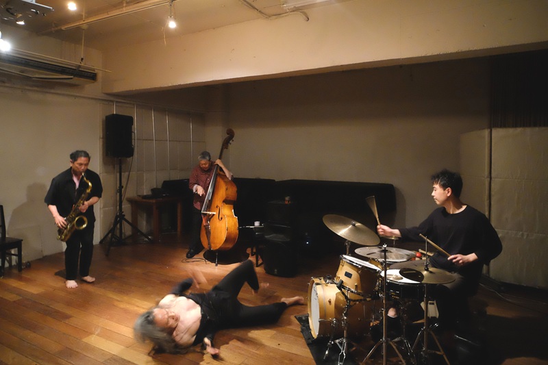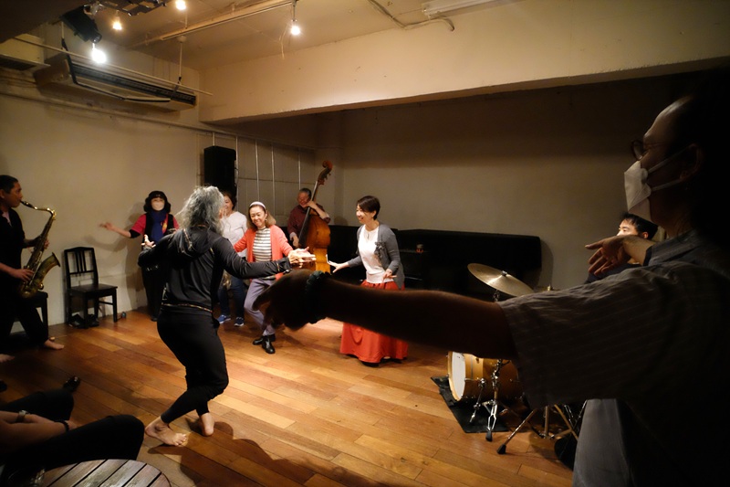戸松美はなかなかステージに現れなかった。やがて向こう側から聞こえてくるあらあらしく床を蹴る音。これが劇的に山下・青木デュオのエネルギーを不連続的に持ち上げる。登場した戸松美は流れをかき乱し、さらにふたりのエネルギーを引き出してみせる。セカンドセットでは一転して調和の役割を演じ、ステージ全体をなにか大きく包んだように感じられた。