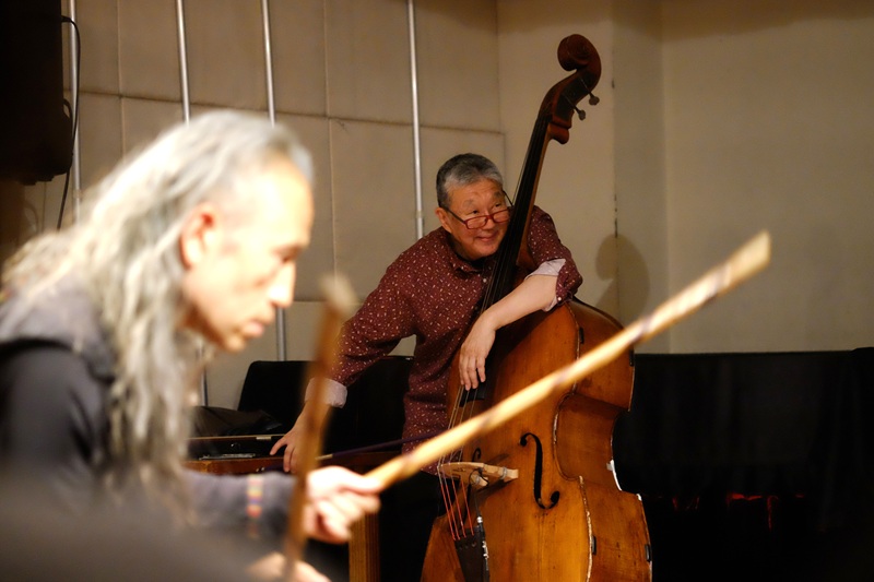 「熱いフリー」が演者と観客を隘路に押し込めて二進も三進もゆかなくなることがあるとして、今般の演奏は「開かれた即興」である(と、意識して企画したわけではなかったが、結果としてそれがみえた)。青木のコントラバスは「開かれ」を愉しむものだっただろう。