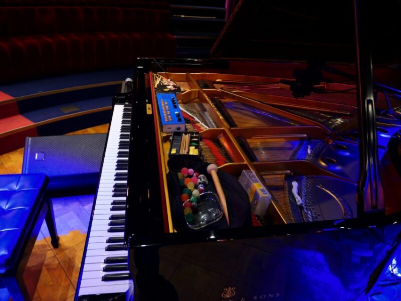 オープニングの〈Fades〉が始まると、コリンがピアノの中に手を入れ、何か機械を操作している(写真に写っている青いボックスはシンセサイザーとのこと。楽器そのものというより、エフェクター的な使い方をしていると思う)。メロディは特になく、電気で増幅されたピアノの単音の反響音が鳴り響く。サトリウスが小さく細かなシンバルでハーモニーを付ける。コリンは右手で細かく弾き始め、同時にピアノの中にも手を入れ、直接ピアノ線を弾(はじ)いているようだ。サトリウスがシンバルをスティックで擦り、その反響音が空間に何度もこだまする。鈴や鐘状のものをいくつも鳴らしながら、エフェクターをかけたピアノの音と重なり増幅していった。