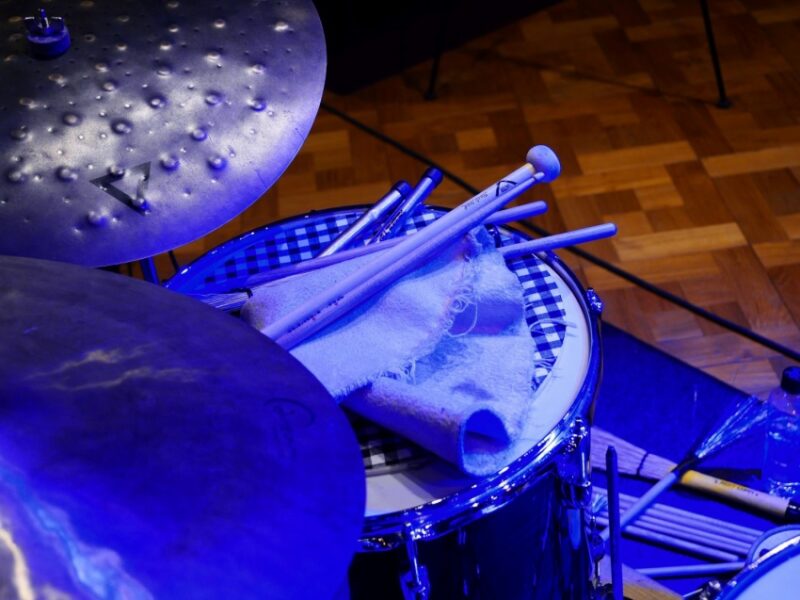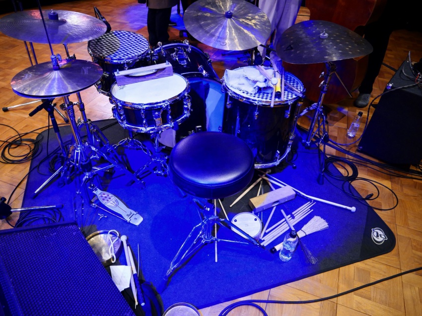 このピアノトリオのサウンドはとても独特で、特にプリペアード・ピアノで様々な細工で音響を工夫していることもあり、演奏の前にピアノの中を覗かせてもらった。演奏中にはサトリウス(ds)が通常のスティックやブラシだけでなく、菜箸のような細いスティックやマレット、手帚様のものまで使用し、シンバルには布を被せたり多様なサウンドを創出していた。パトリスもアルミホイルをベースのブリッジ付近に挟み、金属的な音響を作り出す様子が見て取れる。