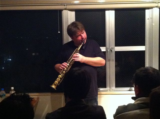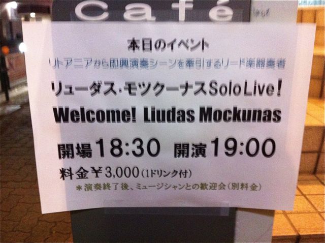 区民ホールは大使館主催の公式イベントだったが、残りの2ヶ所は20人に満たないリスナーを対象にした手作りのインティメートなライヴ。しかしこれが思わぬ成果をもたらした。吉祥寺のズミにはピアノがなく、リューダスのソロになったが、結果的にリューダスが全身全霊を傾け秘術を尽くした演奏を披露することになった。なかでも10分を超すテナーによるサーキュラーブリージング奏法は人間業とは思えぬ壮絶、崇高な内容だった。合間にはリードを外したソプラノをフルートのように横に構えて吹くなどの余芸も見せた。2部はリューダスを囲むアフター・アワーズで、リスナーのなかにリトアニアで演奏した経験のあるミュージシャンが3人もいるのを知り驚いた。他に音楽関係者が3人。リトアニアは人口数百万の小国だが訪れたことのある誰もが再訪の希望を伝えていた。リューダスに尺八を吹かせる者もいて和気あいあいの時を過ごしたが、リトアニアの音楽シーンについて鋭い質問が飛ぶ場面もあった。