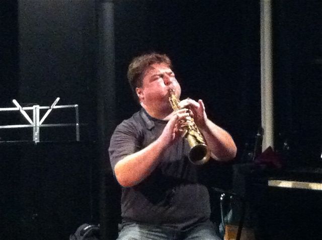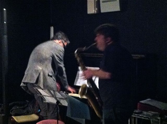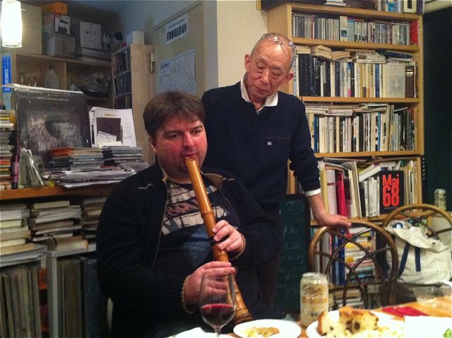 翌日は水道橋のftarri(ふたり)。ビルの地下でスペースの半分はCDやグッズ売り場が占める。ノイズやエレクトロ系ではファンをうならせる品揃えだという。店主はコロラドでチャーリー・パーカーを中心にバップを研究していたというから面白い。アップライトとはいえピアノがあるのでソロを含むペトラスとのデュオとなった。デュオではCD収録の組曲を演奏したが、公式イベントのお行儀の良い演奏とはがらりと変わってグルーヴィーなノリの良い展開となった。組曲のテーマやモチーフをいわゆるリフに使い、ソロで遊んではリフに戻るというパターン。大柄なペトラスにはピアノが小さ過ぎたが、ノってくると椅子から腰を浮かしあたかもジャズ・ピアニストの様相。リューダスはソロの場面で、ピアノのペダルを強く踏み込み、弦のうなりをバックにソプラノを吹いたり、椅子にベルを押し付けミュートをかけたりの新技を披露した。