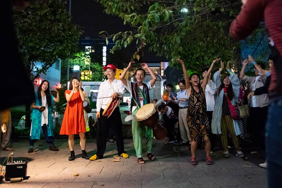 シュールな不条理劇を思わせるセッションの後を受け、駅前の公共空間を盛り上げたのは、co.山田うんのメンバーとしても活躍する飯森沙百合に、この日仕様のダンサー&シンガーを含む7人編成で臨んだサンドラム。3人の打楽器奏者が繰り出す分厚いリズムに歌や踊りが載り、唯一無二のトライバル&マージナルな音塊を生み出すサンドラムだが、この日も期待を裏切らない熱演を聴かせてくれた。オーディエンスはもちろん通りすがりの親子、プラカードを掲げたパチンコ店の店員までその場にいた人々を次々に呼び込み、即席の共演を次々と披露。飯森がすかさず呼応して華やかな舞いを煌めかせる。このカオスと熱狂に身を任せつつ、要所を確実に締めるその存在感が頼もしい。宴もたけなわといったタイミングで、やおらばら撒かれたのは竹製のカスタネット(?)。その場にいた全員が打楽器奏者と化し、否が応でも駅前はさらに盛り上がる。文字通りの一体感を全員が味わいつつ、オーディエンスは駅の反対側へと向かう。