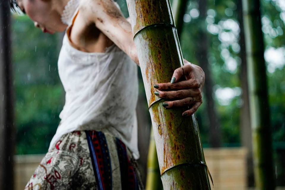 最近では「京王線の自由が丘」とも呼ばれるなど、再開発の手が入ったお洒落な街というイメージも強い仙川だが、実は中心部からほんの10分弱ほど歩くだけで、武蔵野の昔を色濃く残した風景が広がる土地柄でもある。本日2番めの舞台「山内ぶどう園」もそんな佇まいを代表する場所の一つ。その広い敷地の奥の竹林で、まさしく竹林の七賢人のごとくに待ち受けていたのは、男女ユニット3日満月などでも活動する、ヴァイオリン&ヴォイスの佐藤公哉。本降りの雨の中、中村はここからギアを一気に上げる。ぬかるむ足場、打ち付ける雨、竹や雑草が密集する湿地という最悪に近い条件の中にあっても—-いや、そんな状況だからこそ、ダンサーの裡に発動するサムシングを燃料に、跳ね、翔け、泥をものともせず転げ回り、その場にいた全員を完璧に魅了。佐藤の中世ヨーロッパ調のヴォイスが雨に溶け込み、非現実感いや増す中、一行は最終目的地へ。