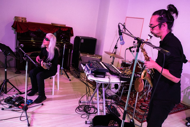 いっぽうの吉田はいつもそうであるように全力で爆走し、小金丸は待ったなしの暴風雨に突入してさまざまに着色した。高円寺百景に小金丸が加入したあとのアルバム『Dhorimviskha』(2018年)は強烈なスピードと変拍子のもとに狂騒的で煌びやかともいえるユニゾンと逸脱が冗談のように集約された傑作だが、ここに貢献している小金丸の個性を目の当たりにすることができた(つまり、めっちゃカッコよかったのです)。シロイシも含め誰も振り落とされることのないスリリングな展開、観客は誰もがエクスタシーを満喫しているようにみえた。