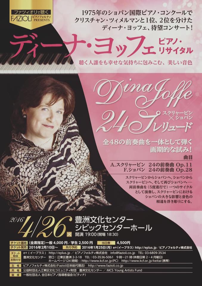 Concerts/Live ShowsNo. 218 #891 ディーナ・ヨッフェ 「ピアノリサイタル」 2016年6月1日 伏谷佳代 この日はファツィオリ社の主催による、スクリャービンとショパンの『24の前奏曲』計48曲を1曲ずつ交互に織り交ぜて演奏するという実験的な趣向。 続きを読む
